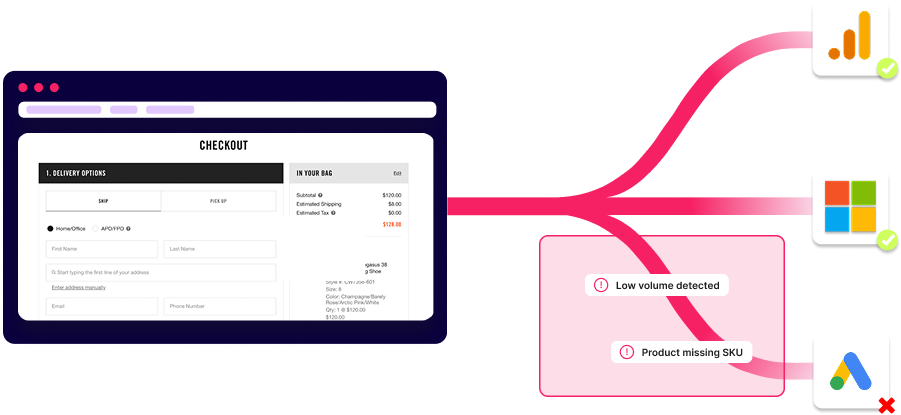 Fonctionne sur l'ensemble de votre pile GA4, GTM, Meta, TikTok, Google Ads : si cela se déclenche, nous le vérifions.